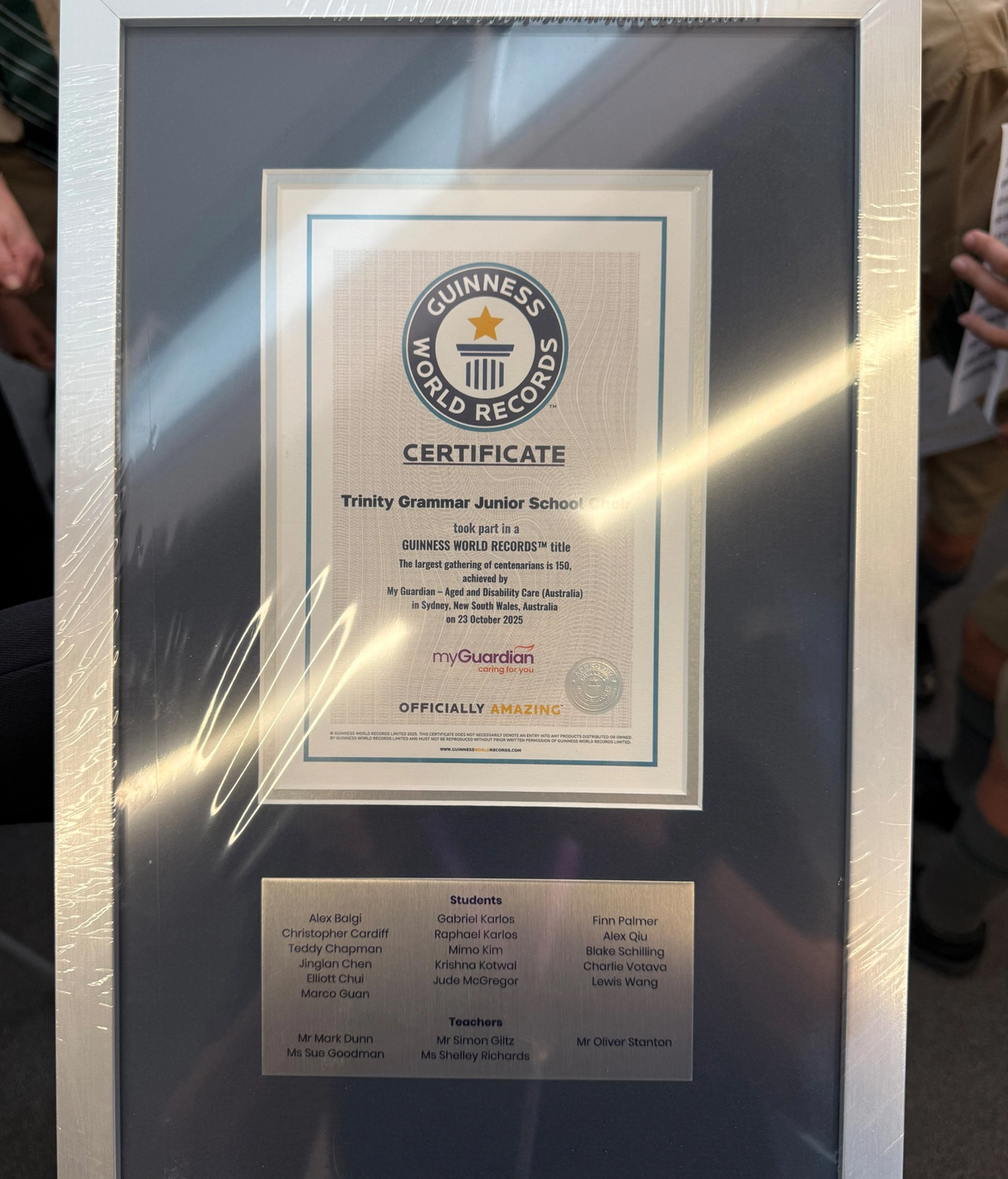 To thank the choir for their incredible contribution to our world-record day, representatives from My Guardian recently visited a Trinity Junior School Assembly to present the boys with a commemorative plaque.