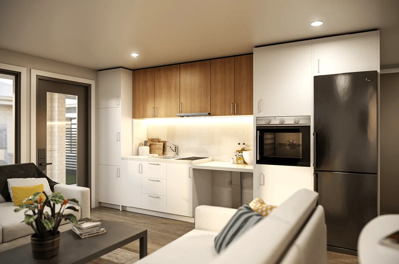 Provisioned for automated unit front door and blinds, structural provision for ceiling hoists, height-adjustable kitchen bench.